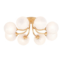 Small globes of opal cloud glass rest on sprawling, curved arms giving Onyx an uplifted and airy feel. Etched on the inside, the globes create a warm light. An extra layer of patina gives the gold leaf finish on the metal work its vintage look. Available as a single or 3 light sconce, 8 light flush mount or 6 or 12 light chandelier, there's a place for Onyx in any space.