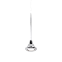Single LED lamp pendant, slender trumpet shaped with bottom frosted diffuser. Chrome canopy and metal details, adjustable wire up to 72 inches.