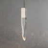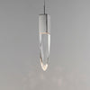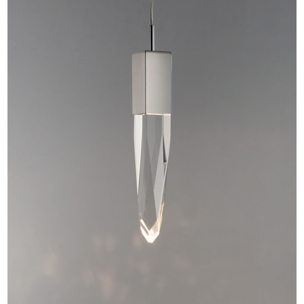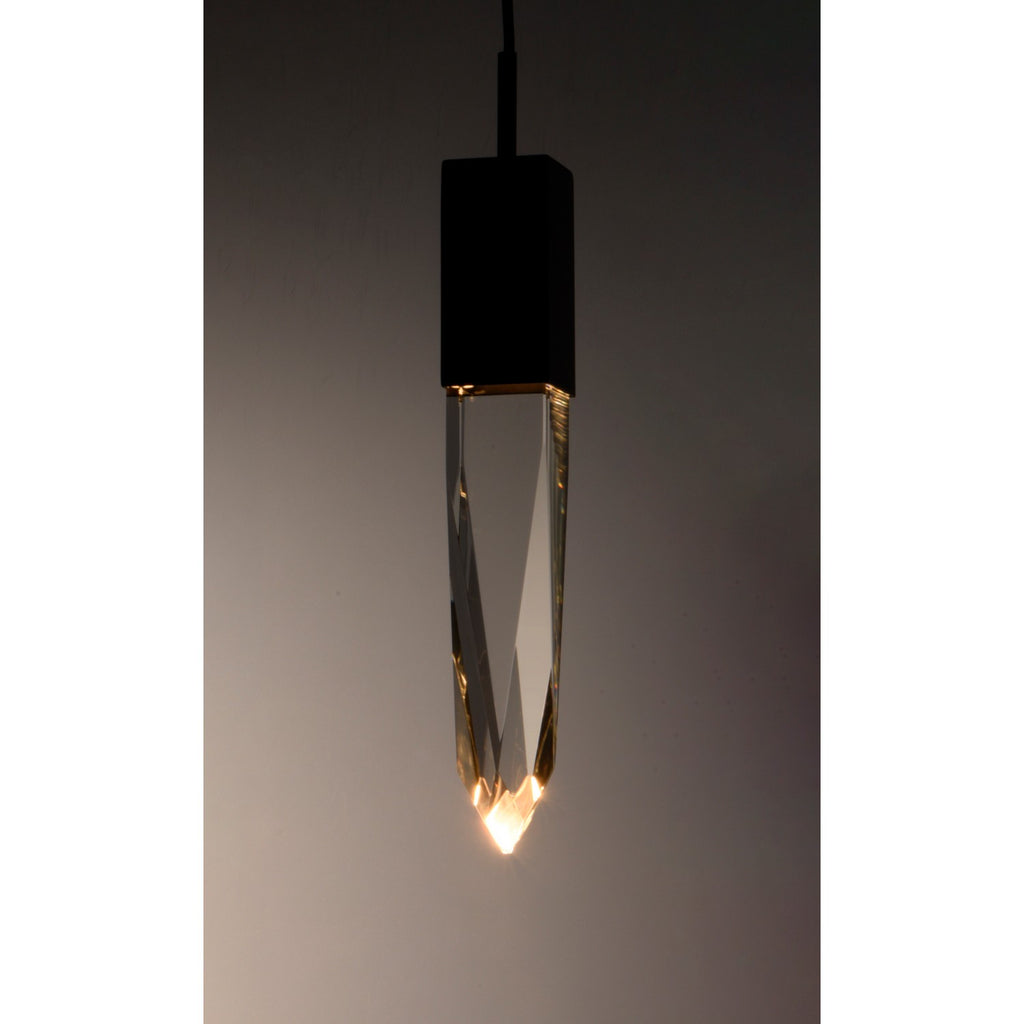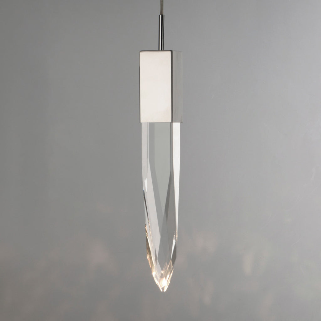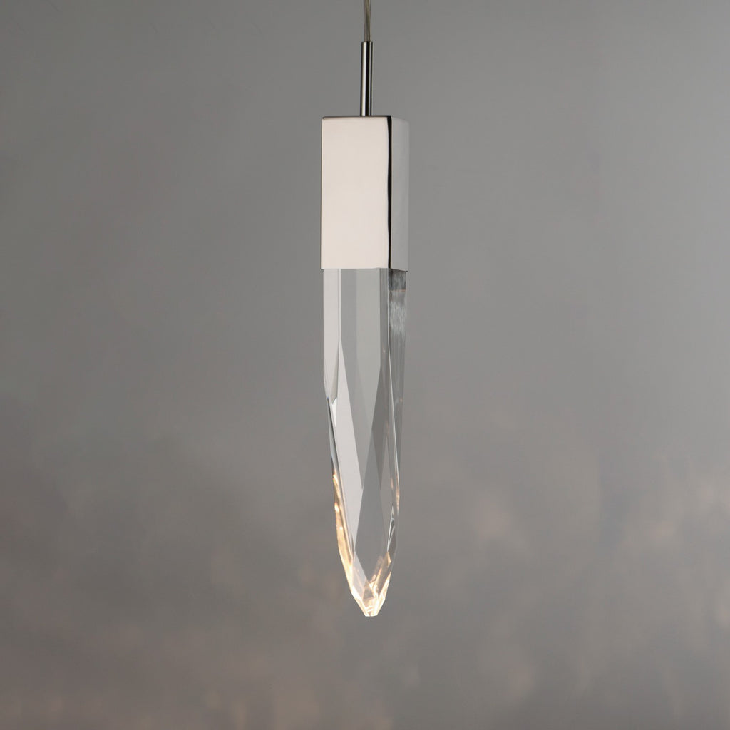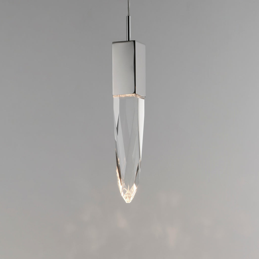 Stalactites of Clear Beveled crystal suspend from your choice of Polished Chrome or Black supports, can be hung at various heights to create a spectacular array. The crystal shimmers as light diffuses through the facets powered by 90 CRI LED dimmable modules.