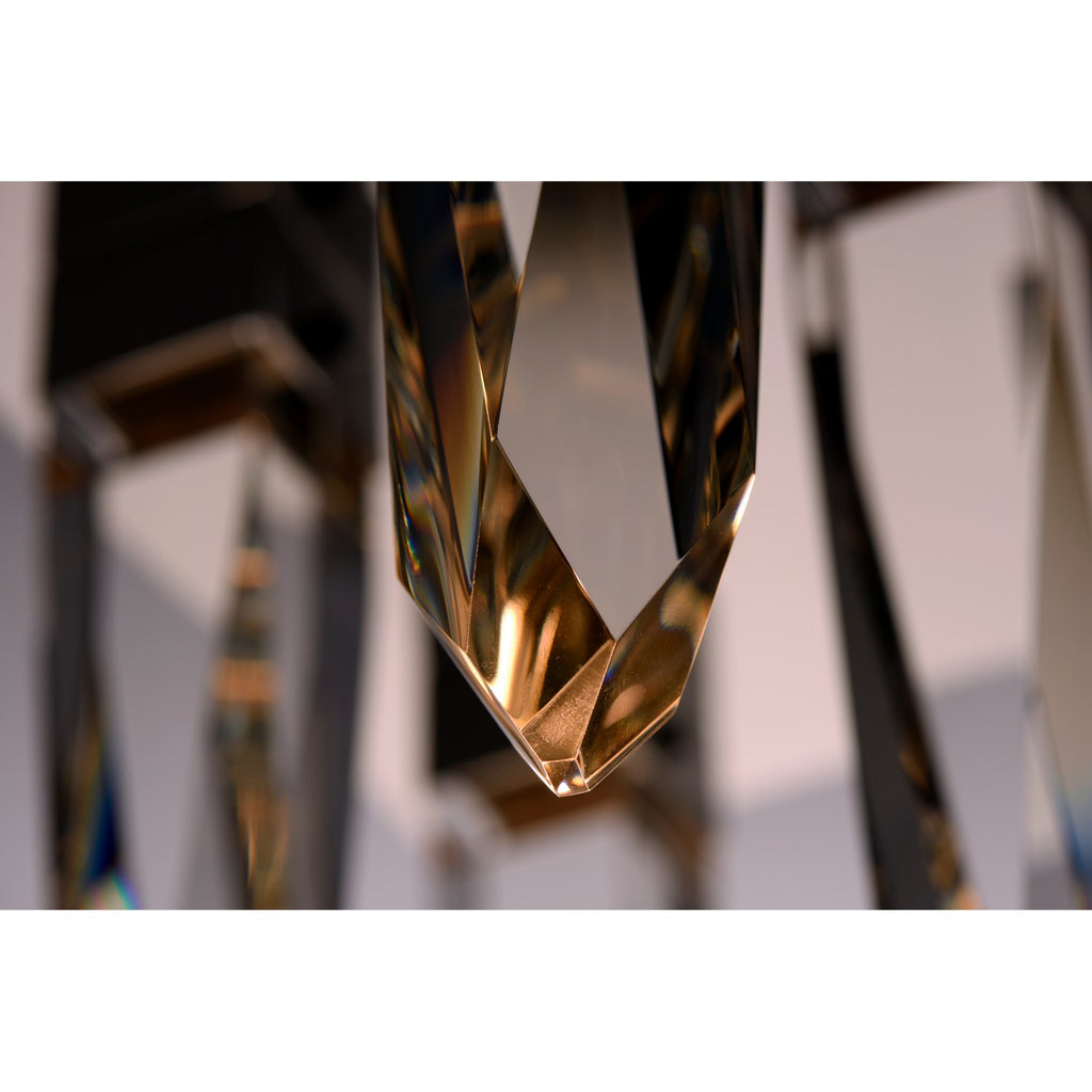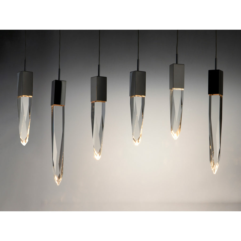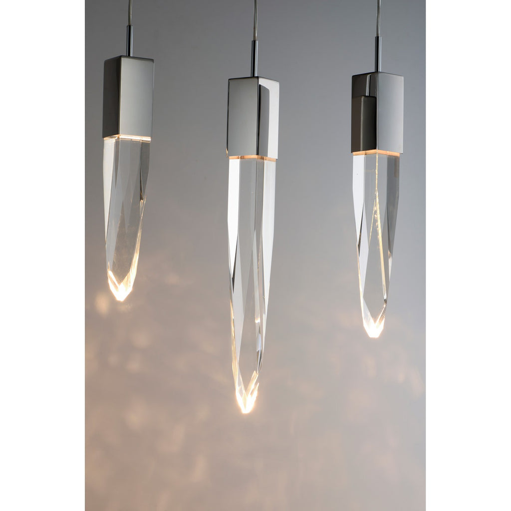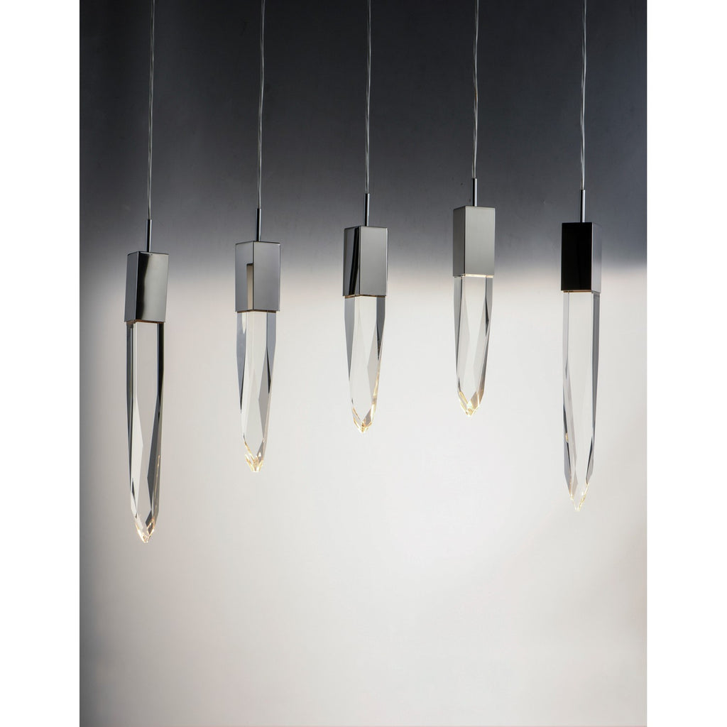 Stalactites of Clear Beveled crystal suspend from your choice of Polished Chrome or Black supports, can be hung at various heights to create a spectacular array. The crystal shimmers as light diffuses through the facets powered by 90 CRI LED dimmable modules.