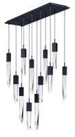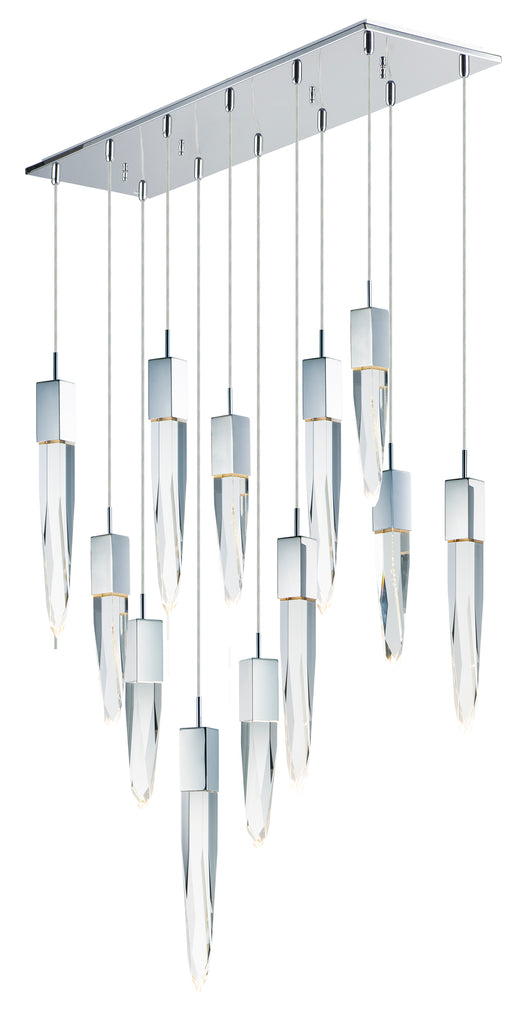 Stalactites of Clear Beveled crystal suspend from your choice of Polished Chrome or Black supports, can be hung at various heights to create a spectacular array. The crystal shimmers as light diffuses through the facets powered by 90 CRI LED dimmable modules.