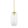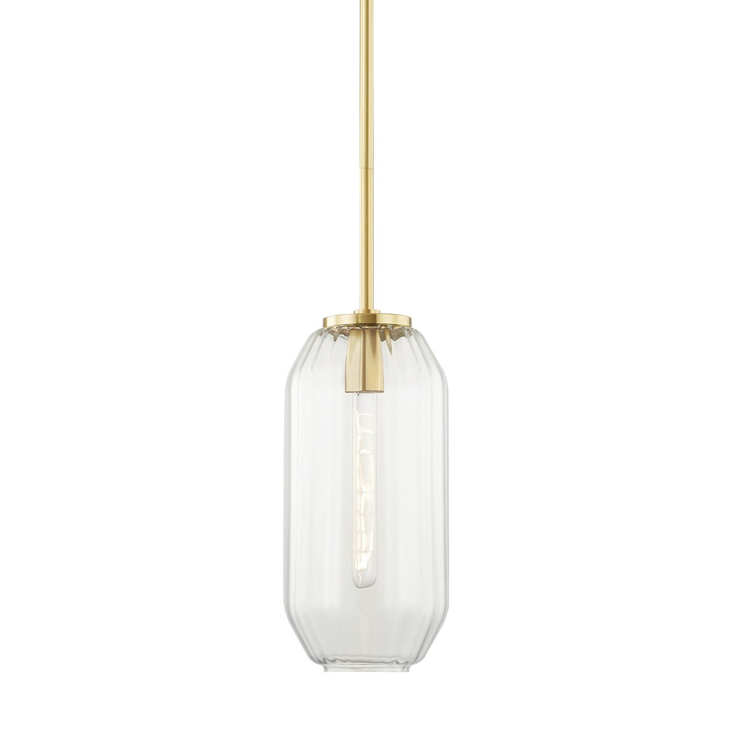 Defined by an octagonal-shaped, ribbed shade, Bennett is glass blowing at its finest. A single carbon filament bulb suspends from a metal bulb base and casts a clear, beautiful glow. Available as an eight, nine and 18-inch diameter pendant in Aged Brass and Polished Nickel finish.