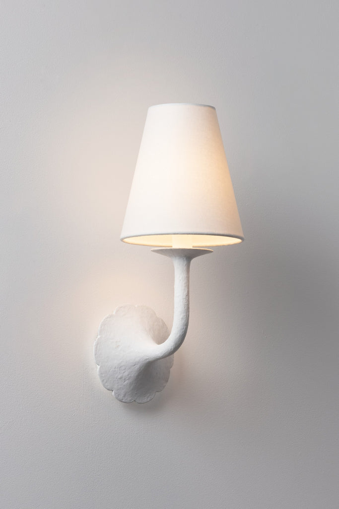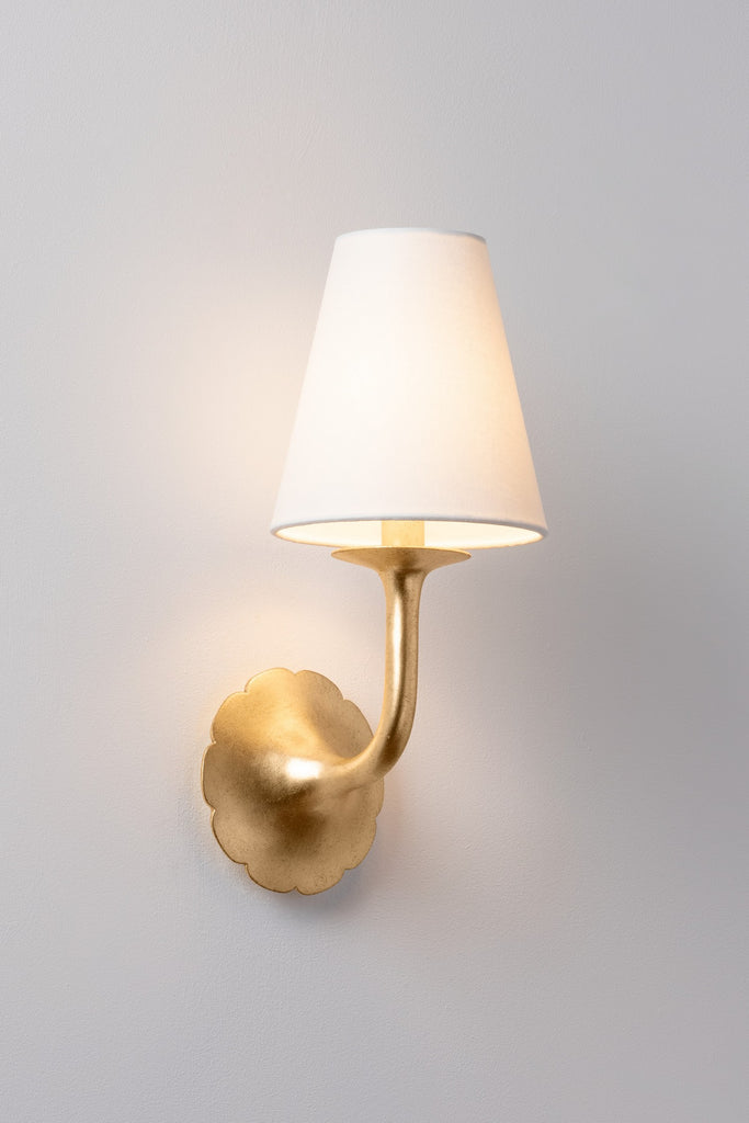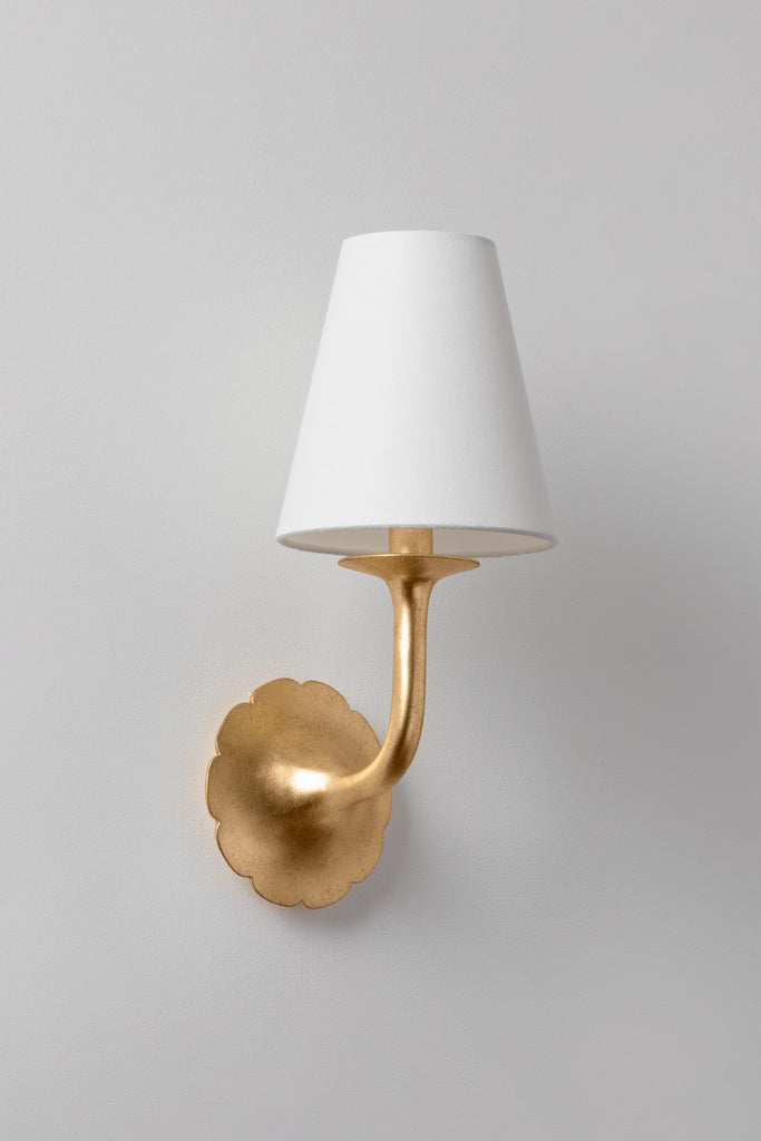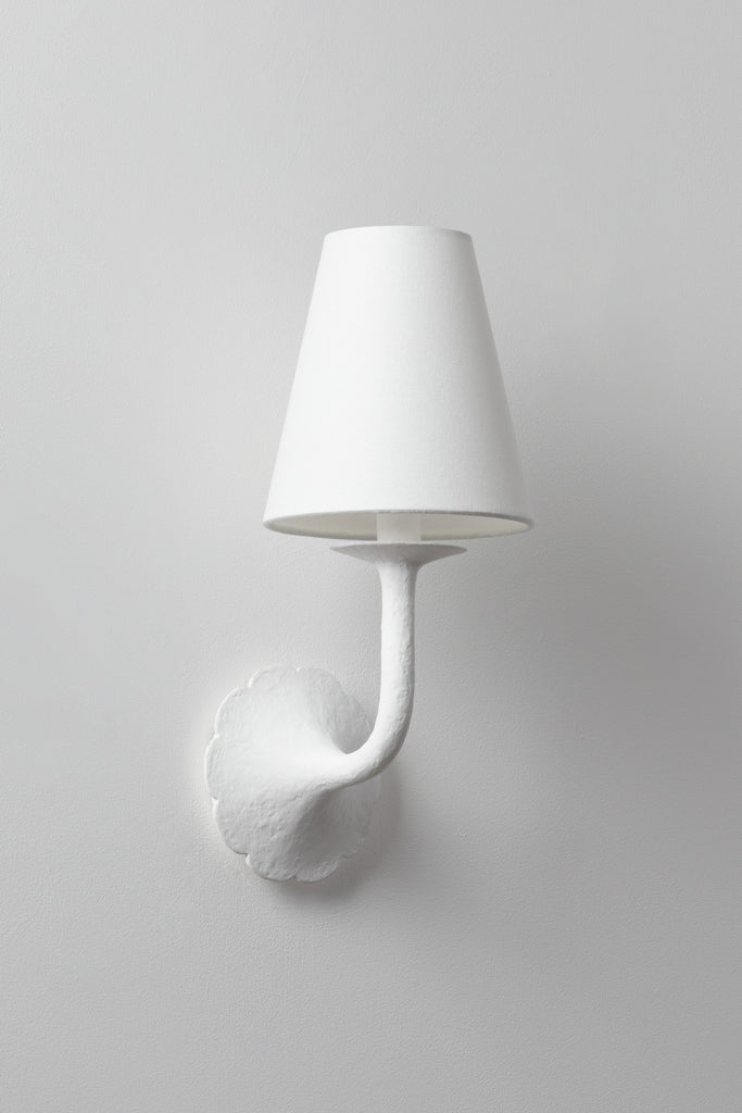 Inspired by a flower in bloom, the charming Winnipeg sconce features delicate scalloped edges and a tailored silhouette. The botanical backplate swoops elegantly upwards to cradle the light source, which glows through a tapered white linen shade. A White Plaster finish imparts a chic, contemporary feel, while the Vintage Gold Leaf is refined and classic.