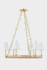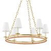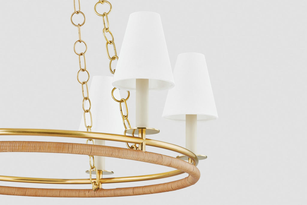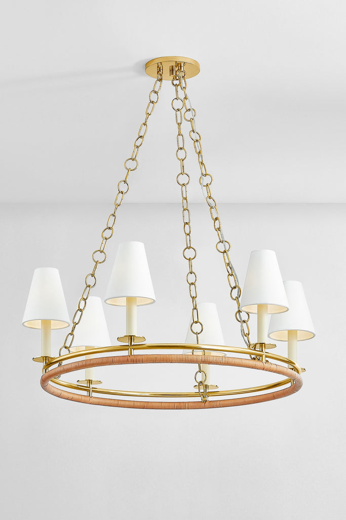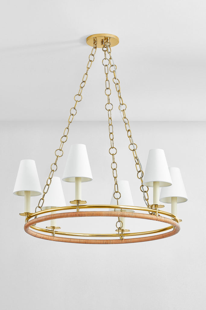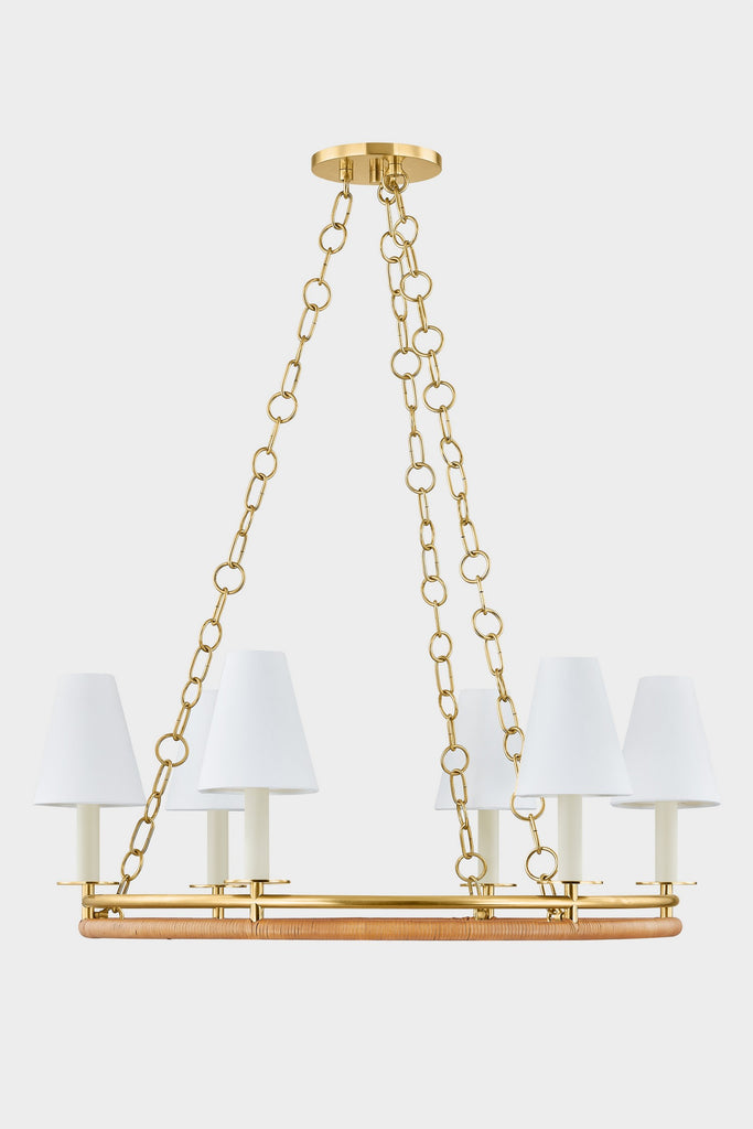 A distinctive double-ring chandelier presents the opportunity to play with mixing materials. As if in conversation, the upper ring of Swanton is finished in sleek Aged Brass, while the lower is cleanly wrapped in natural rattan. Linen shades top cream candlesticks, lending the fixture a light, airy quality that feels nautical. Suspended from three large looped chains, Swanton is available as a 6 or 8-light chandelier.