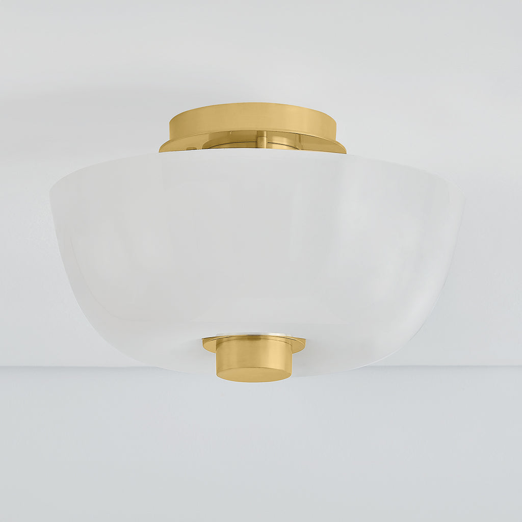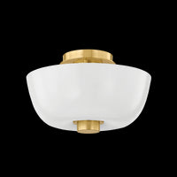 An organic beauty inspired by nature, the bubble-like silhouette of Dove glows from within. This sophisticated flush mount features an outer layer of unetched cloud glass over an inner cylinder of opal shiny glass. Accented with Aged Brass metalwork, Dove adds an artful quality to living and dining spaces.