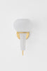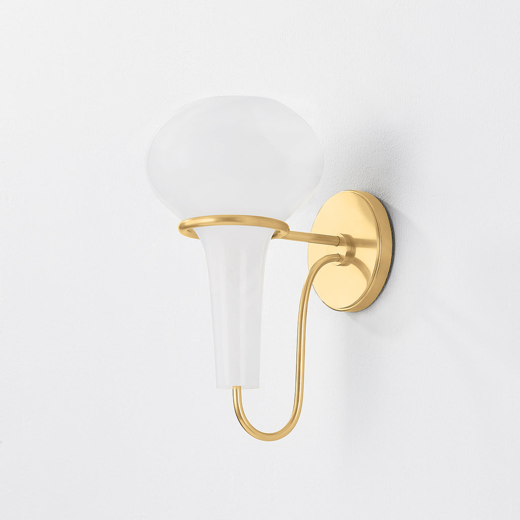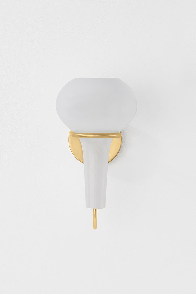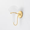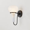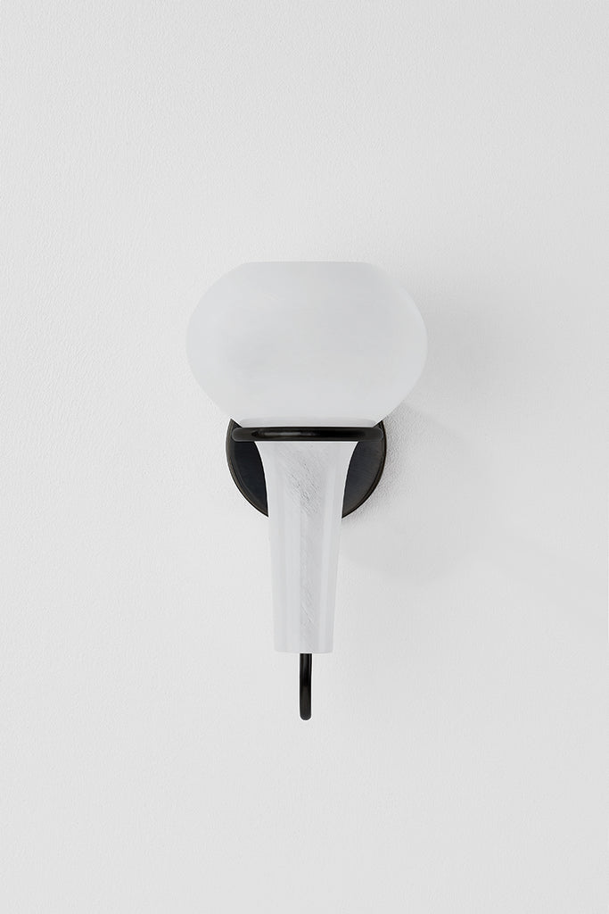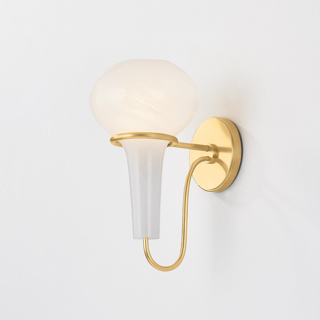 A delicate metal framework supports the upside-down, pear-shaped shade of the Adams Corner sconce. Adding a surprising twist to a vintage silhouette, the swooping metal J-arm is paired with a swirled cloud glass shade. Choose from Aged Brass or Black Nickel metalwork for a more luxurious or industrial finish.