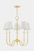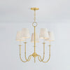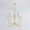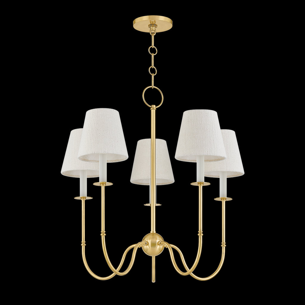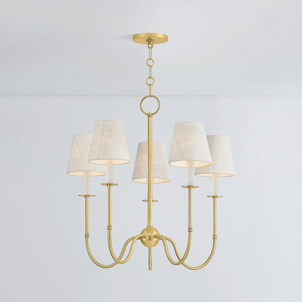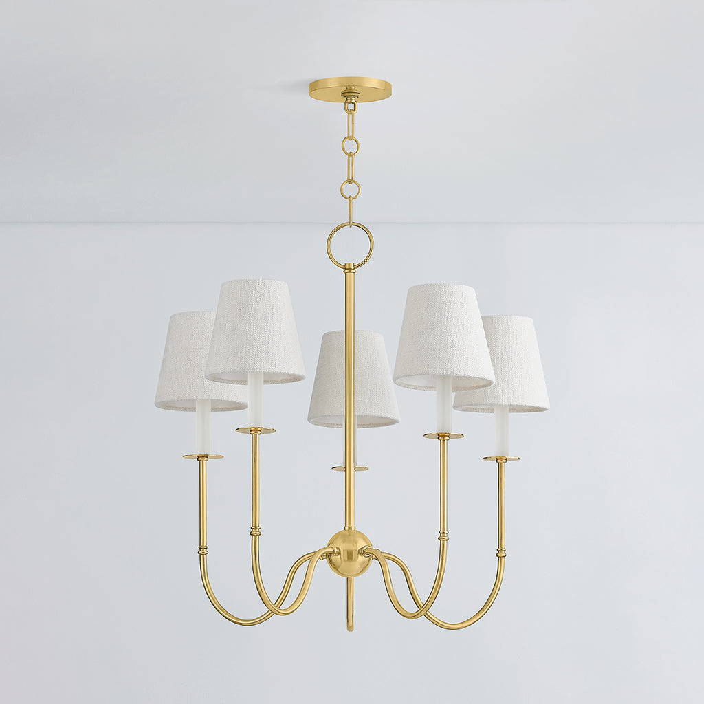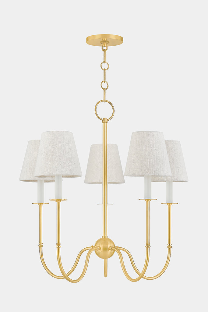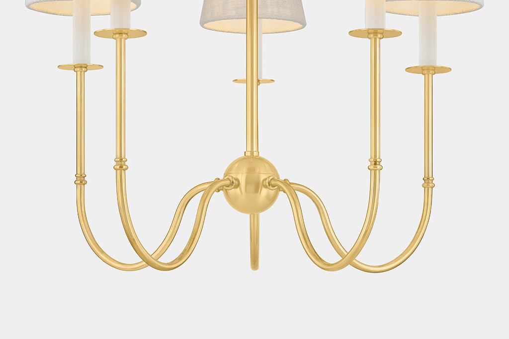 Vintage meets modern in the Amina family. Traditional Victorian metalwork details, including wide bobeches, are paired with contemporary candle sleeves and short white linen shades. Finished in Aged Brass, the slender, elongated J-arms feature a dramatic swoop. Whether as a sconce or 5 or 9-light chandelier, Amina provides a fresh update to traditional forms.