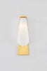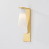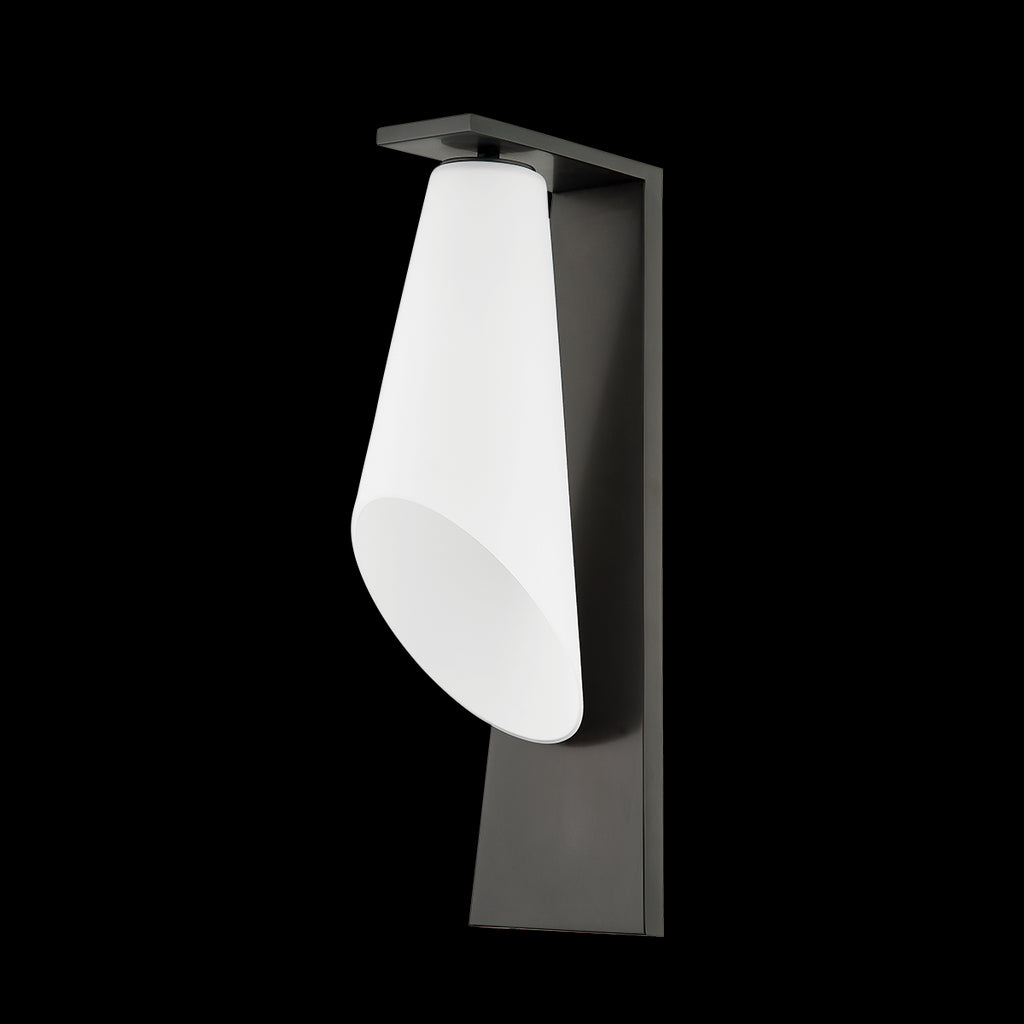 Sharp angles, sinuous curves, and sleek metalwork come together in the architectural Andros sconce. Suspended from an L-shaped backplate, the modern conical silhouette has a bell-like appearance. The opal matte glass shade is bias-cut on the end to create an elliptical opening, projecting light outwards into the room. Choose from either an Aged Brass or Old Bronze backplate for a more classic or modern look.