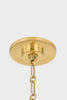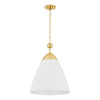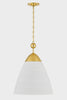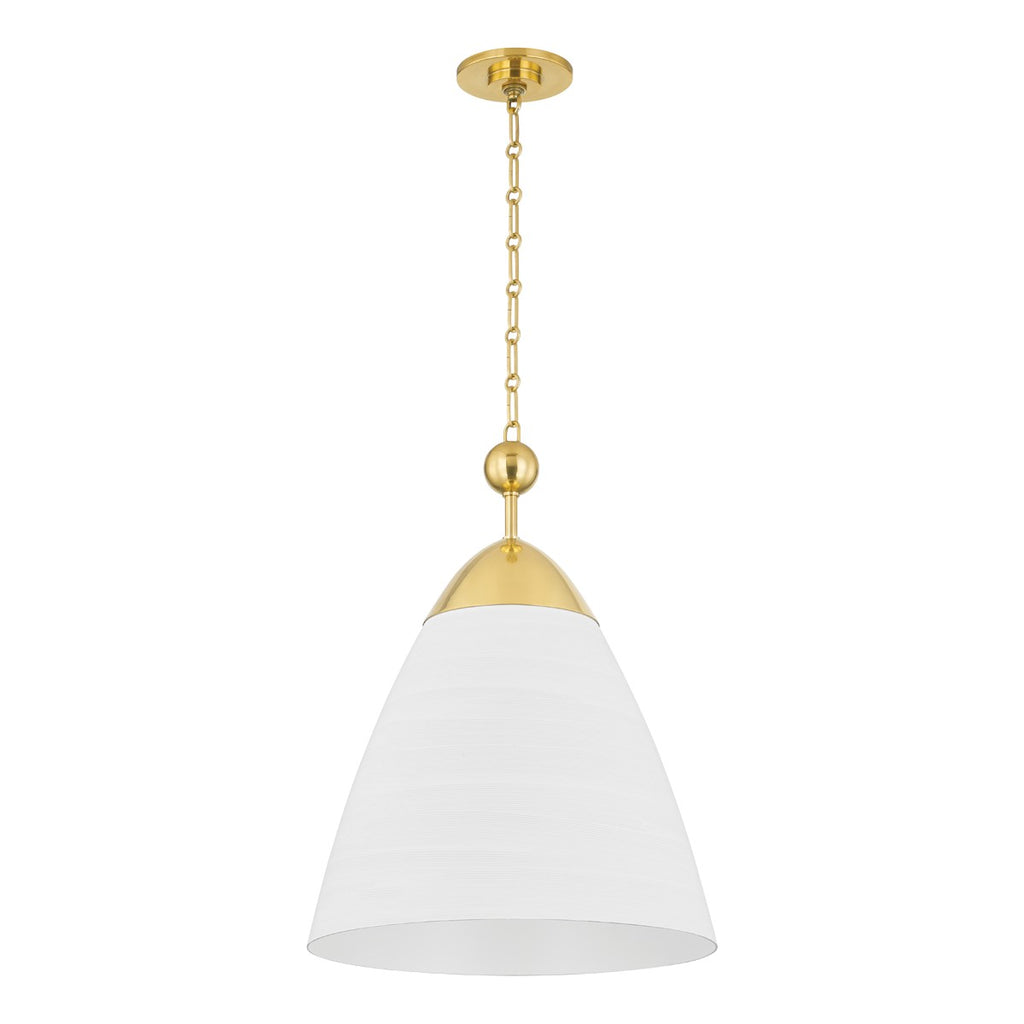 A refined bell-shaped fixture with a modern edge, Bronson features a sleek, tapered silhouette crafted from clean White Plaster. The opaque materiality and funnel shape creates a powerful downlight to fill a large area. Accented by the inviting warmth and reflective nature of Aged Brass, including a large cap and finial, it evokes an organic feel. Available as a chandelier or pendant in two sizes. Part of our Becki Owens collection.