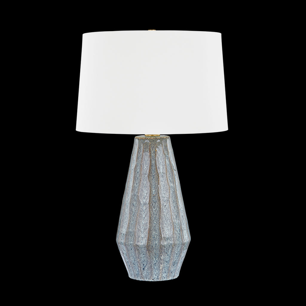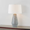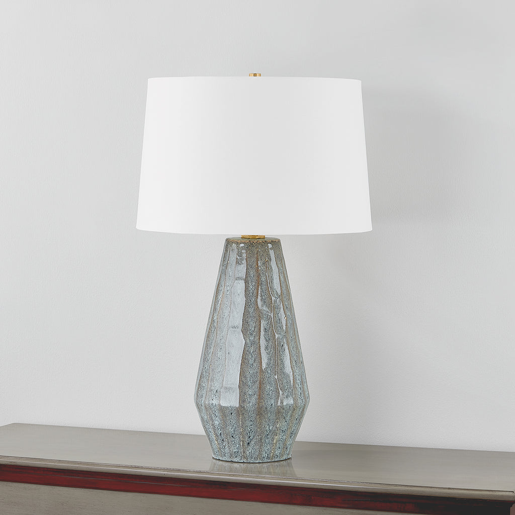 A ceramic lamp featuring a narrow double-tapered base, Alloway evokes understated artistry and a sense of groundedness. Finished in a swirling two-toned, coastal-inspired glaze, the base adds visual complexity and a handcrafted feel to the fixture. The white linen drum shade lends a classic touch to a simple form made modern through its glaze.
