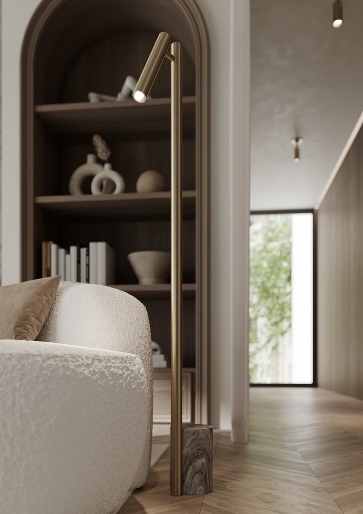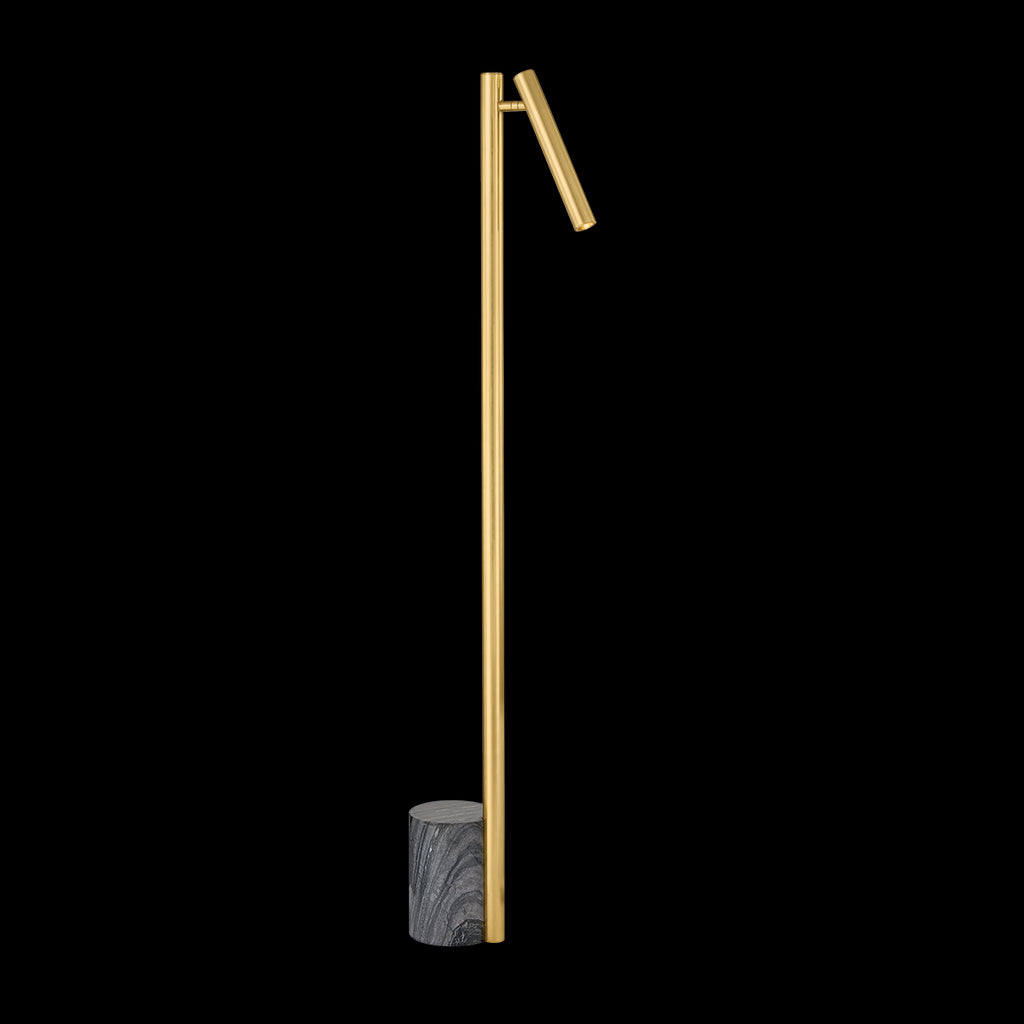 Incorporating CSL’s innovative ‘Whisper’ technology, Circleville cuts a sleek figure in Aged Brass. While it might read as industrial, the elongated tube forms lean towards modernist aesthetics. The articulating shade allows precise control to create a powerful spotlight where needed. Available as a sconce and floor lamp.