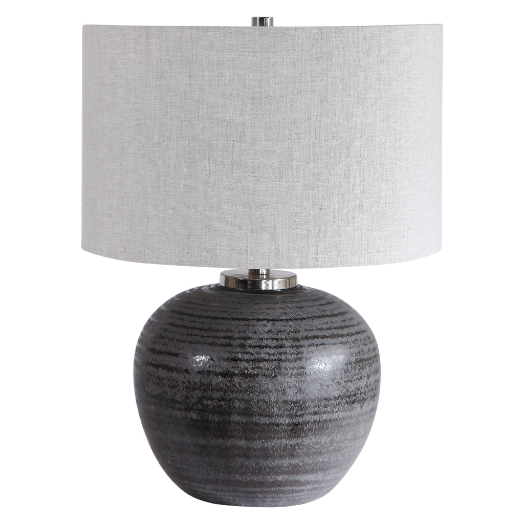 Introducing our exquisite table lamp, exuding a perfect blend of casual and contemporary aesthetics. Its charcoal glaze finish with etched texture adds a touch of modernity to any space. The round ceramic base, accompanied by brushed nickel hardware, creates a harmonious and sophisticated look.