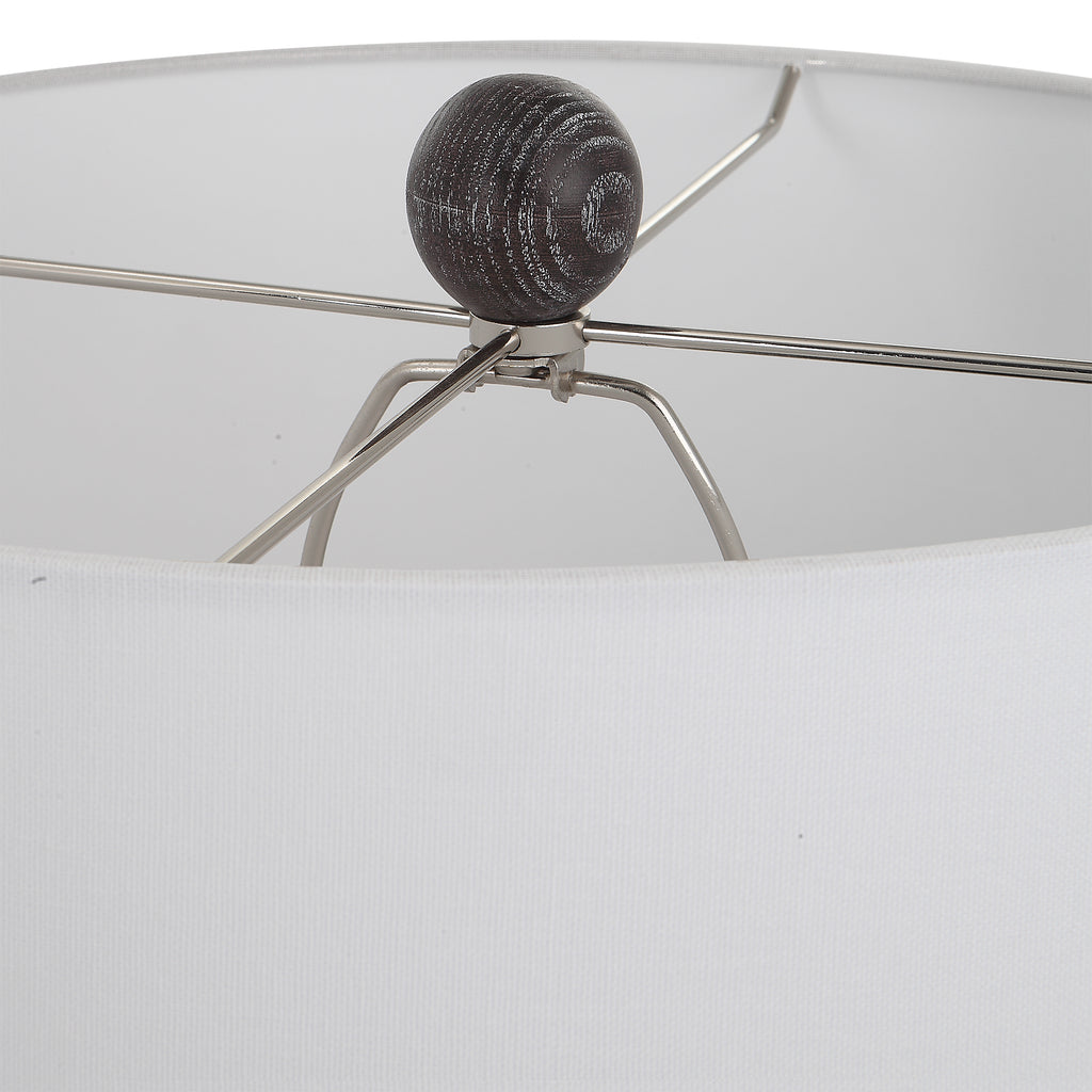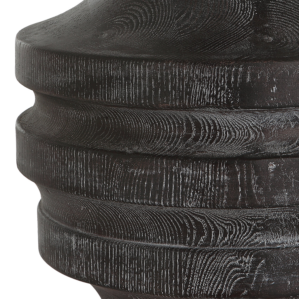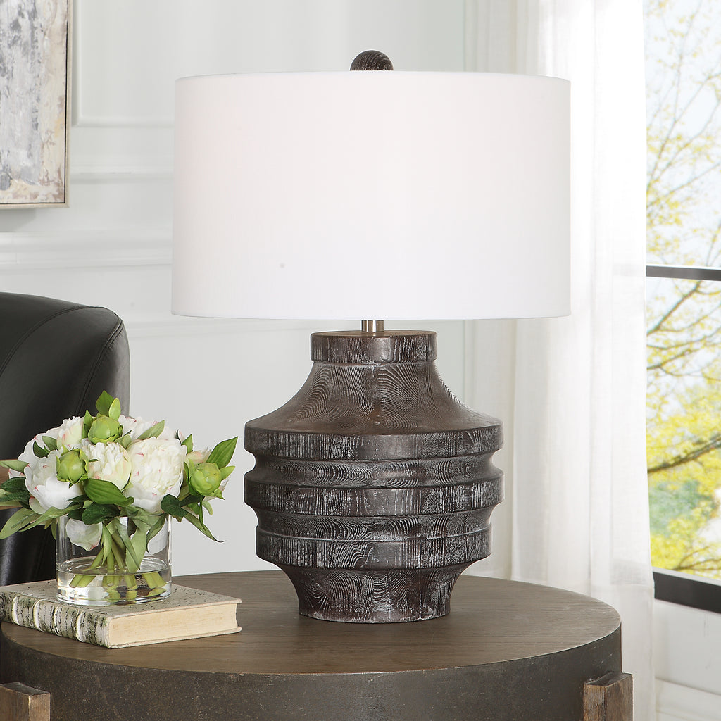 A rustic masterpiece that seamlessly blends nature with luxury. Crafted with meticulous attention to detail, this table lamp features a stunning carved wood design, enhanced by a transparent black stain with warm undertones. The light white glaze delicately highlights the faux wood grain, adding a touch of elegance. Illuminate your space with this perfect rustic accent.