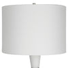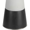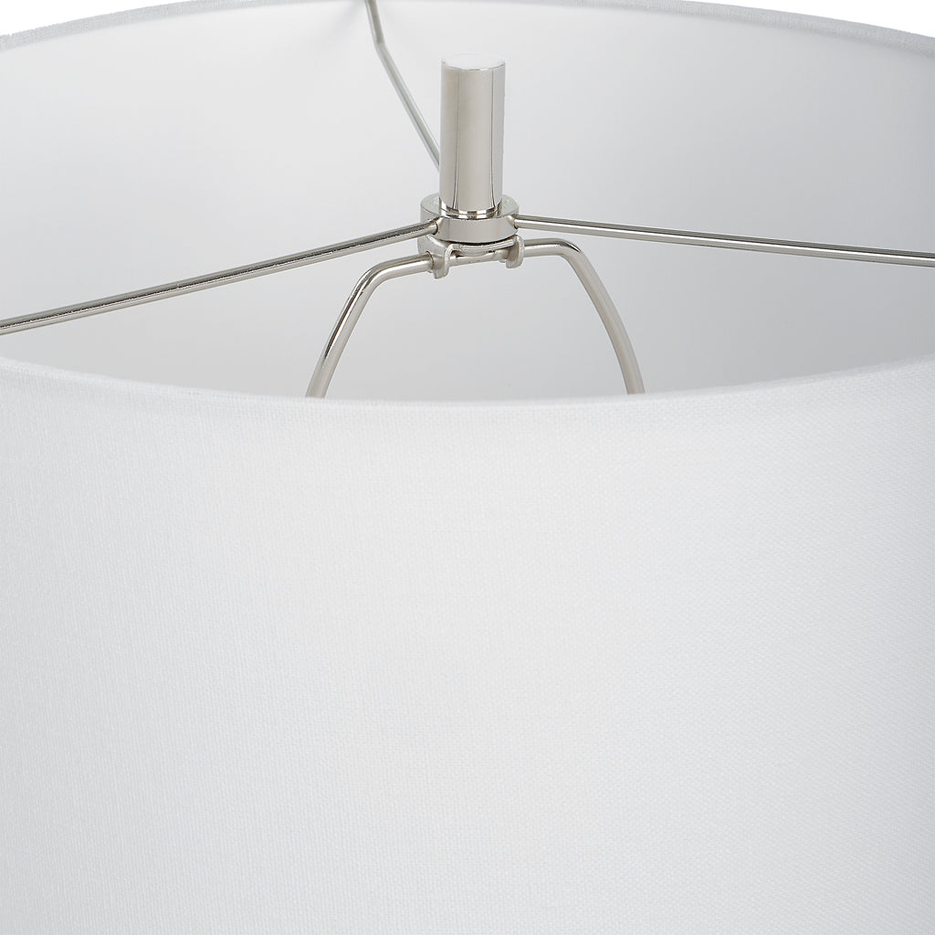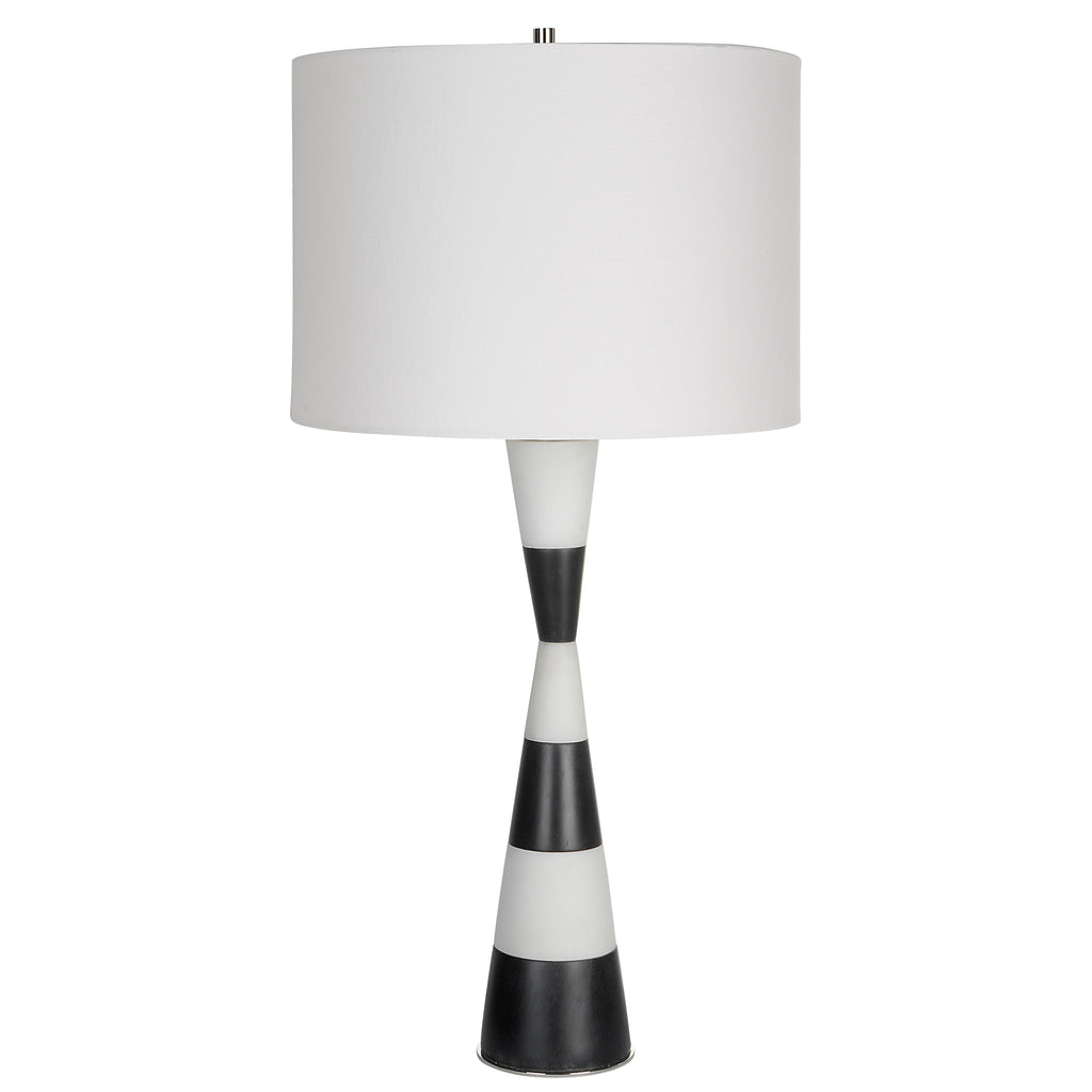 Introducing an exquisite lamp, a true testament to refined elegance. Crafted from a captivating banded black and white man-made stone, its hourglass shape is a stunning embodiment of sophistication. The meticulous replication of Thassos marble further enhances its allure. Polished nickel iron details provide a gleaming finishing touch, elevating this lamp to the pinnacle of luxury. Illuminate your space with the epitome of style and artistry.