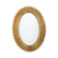 Inspired by Crystorama's iconic Broche Collection, this stunning mirror brings sculptural artistry to wall décor. The mirror features a radiant sunburst design with hand-forged metal leaves arranged to evoke elegance and organic beauty. The intricate leaf-shaped detailing channels a refined sense of nature-inspired aesthetics, adding warmth and charm to any interior. This mirror is ideal as a focal point in entryways, living rooms, or bedrooms, and it pairs beautifully with contemporary and classic design styles.