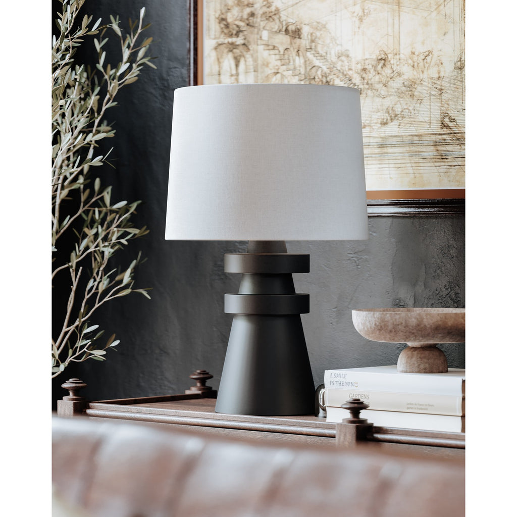 A conical base of charcoal ceramic gives Grover a hand-crafted feel that makes a strong sculptural statement. The ceramic rings add visual interest and balance and the off-white linen drum shade brings contrast and texture to this artistic, modern table lamp.